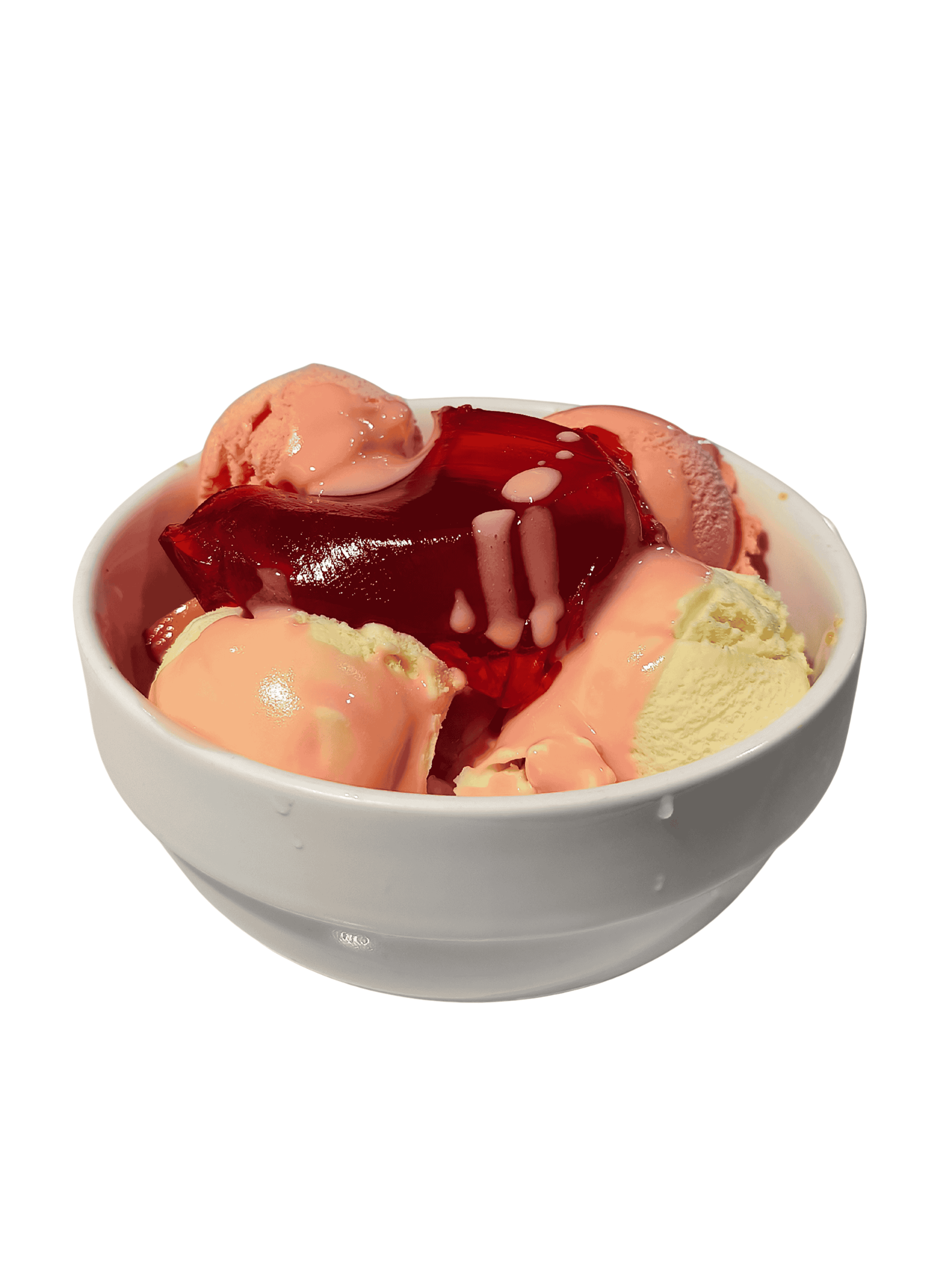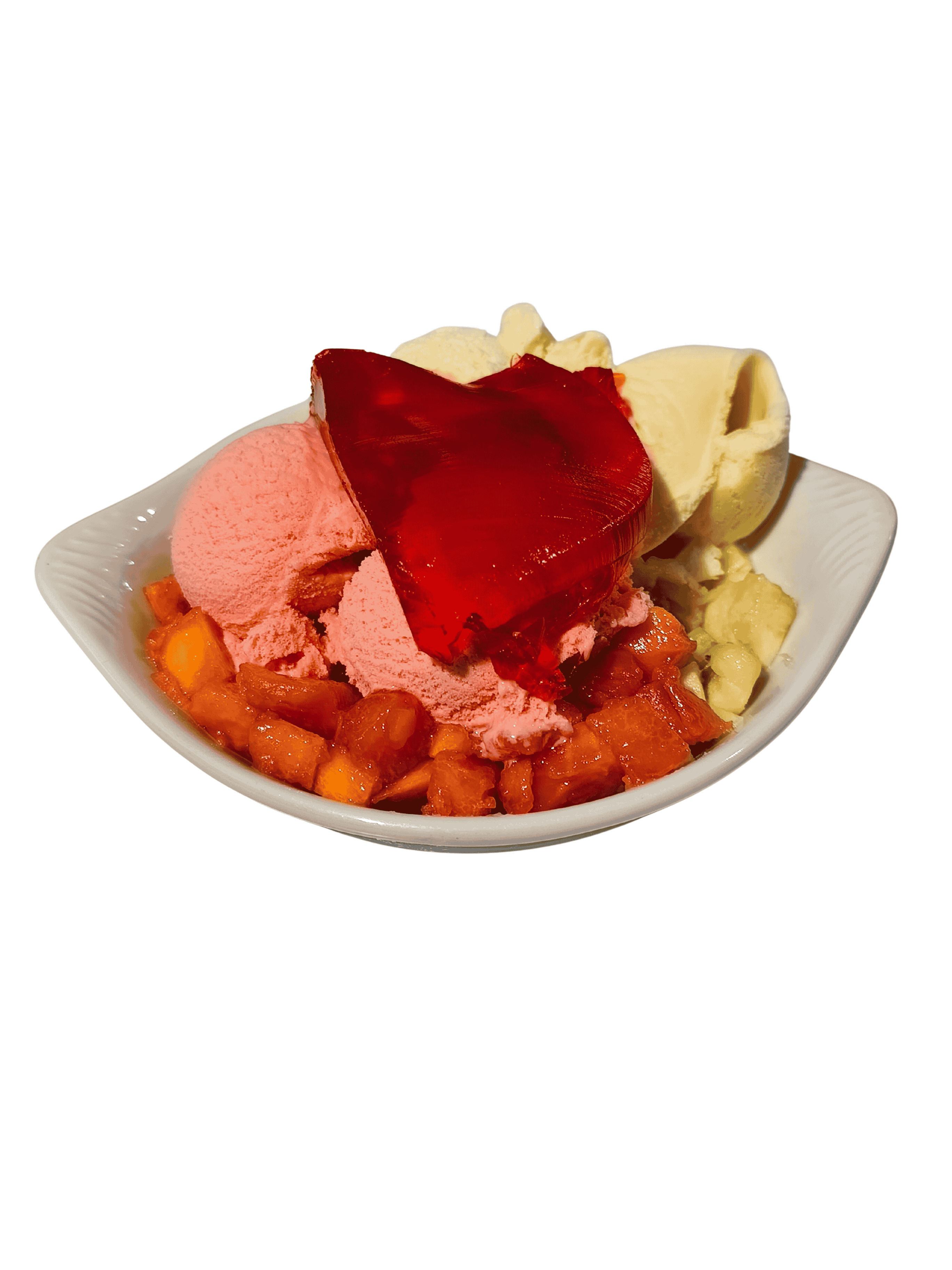 Papaya, Piña, Banano, Fresas, Melocotón, Gelatina, Helado Vainilla y Fresa