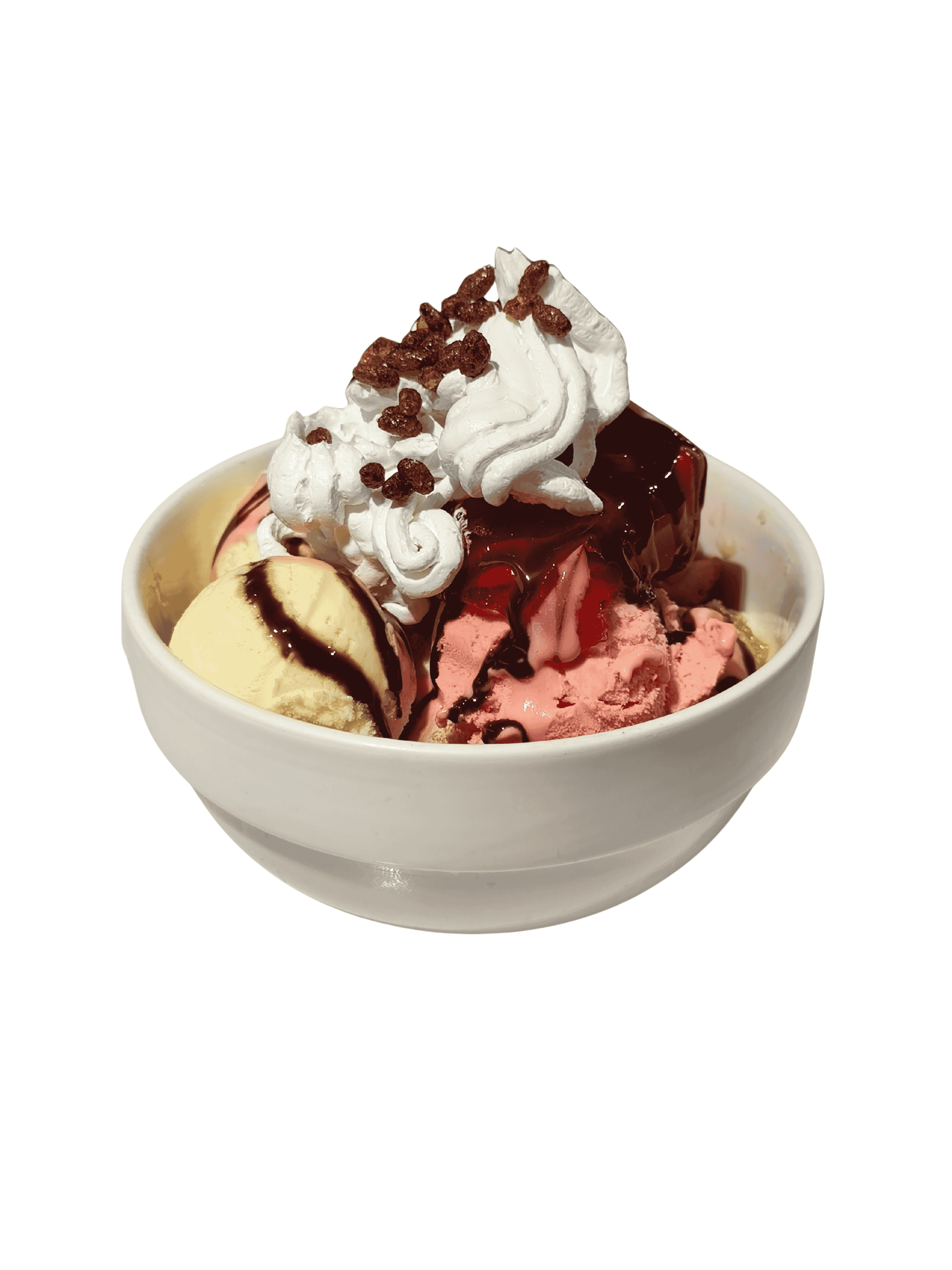Papaya, Piña, Banano, Fresas, Melocotón, Chantilly, Chocolate Liquido, Crispy, Leche En Polvo, Gelatina y Helado de Vainilla Y Fresa