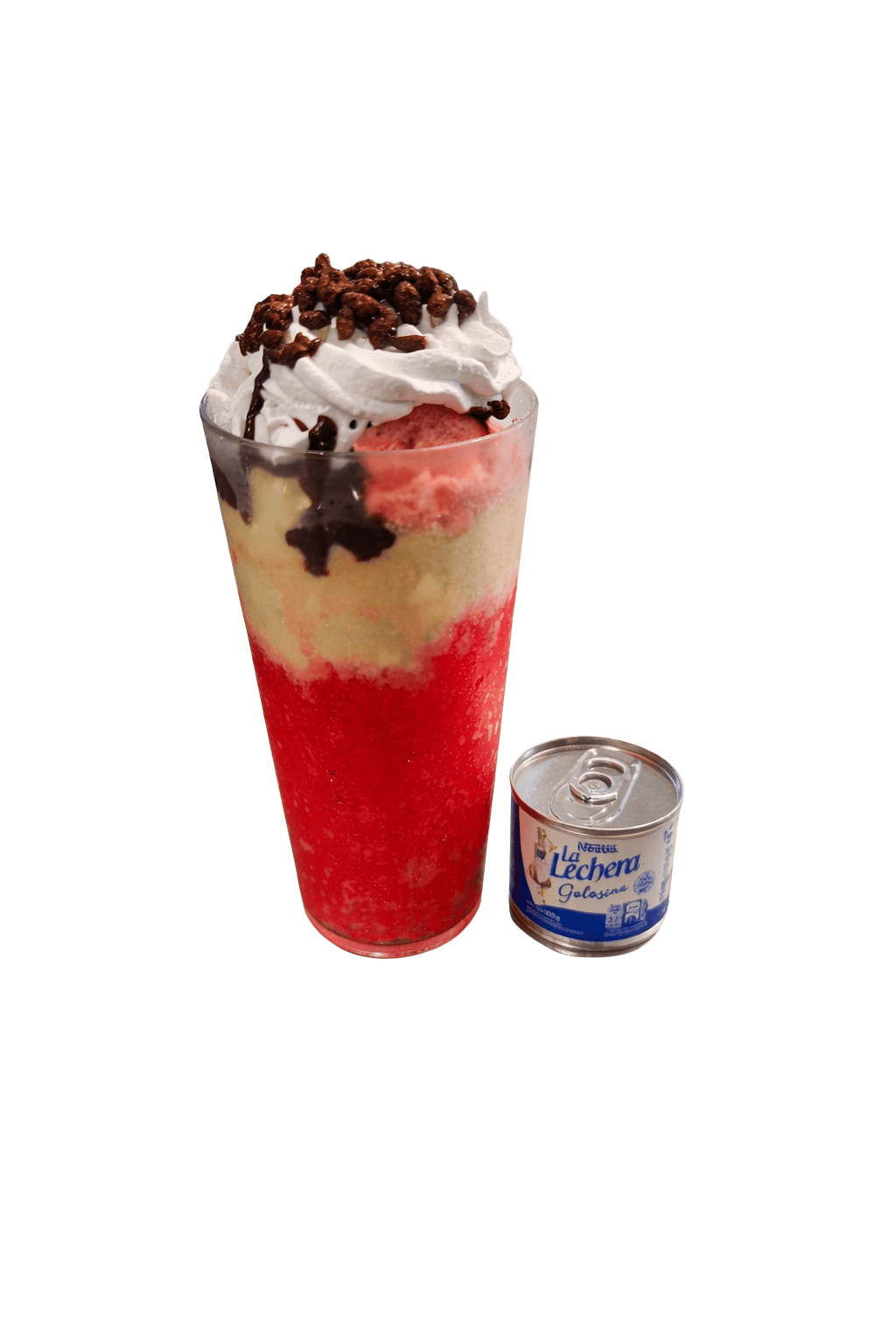 Hielo, Sirope, Leche Condensada, Leche En Polvo, Helado De Vainilla y Fresa, Chantilly, Chocolate Liquido y Crispy