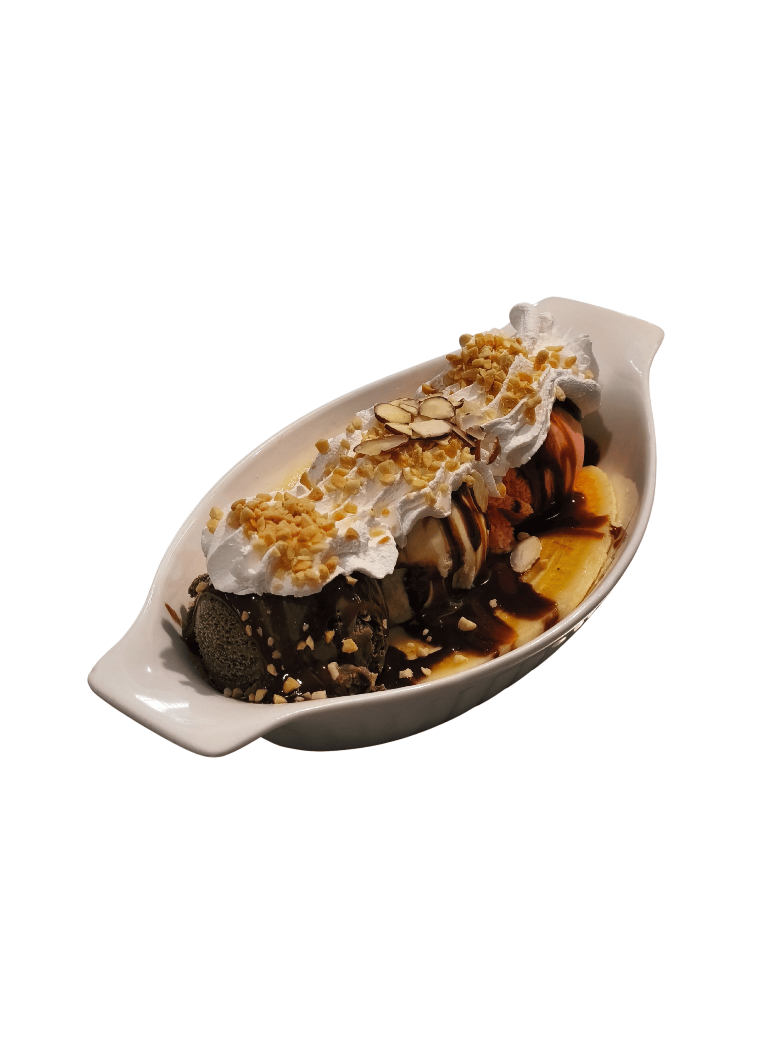 Banano, Helados de Vainilla, Fresa y Chocolate, Topping de Chocolate, Topping de Caramelo, Mani y Almendras