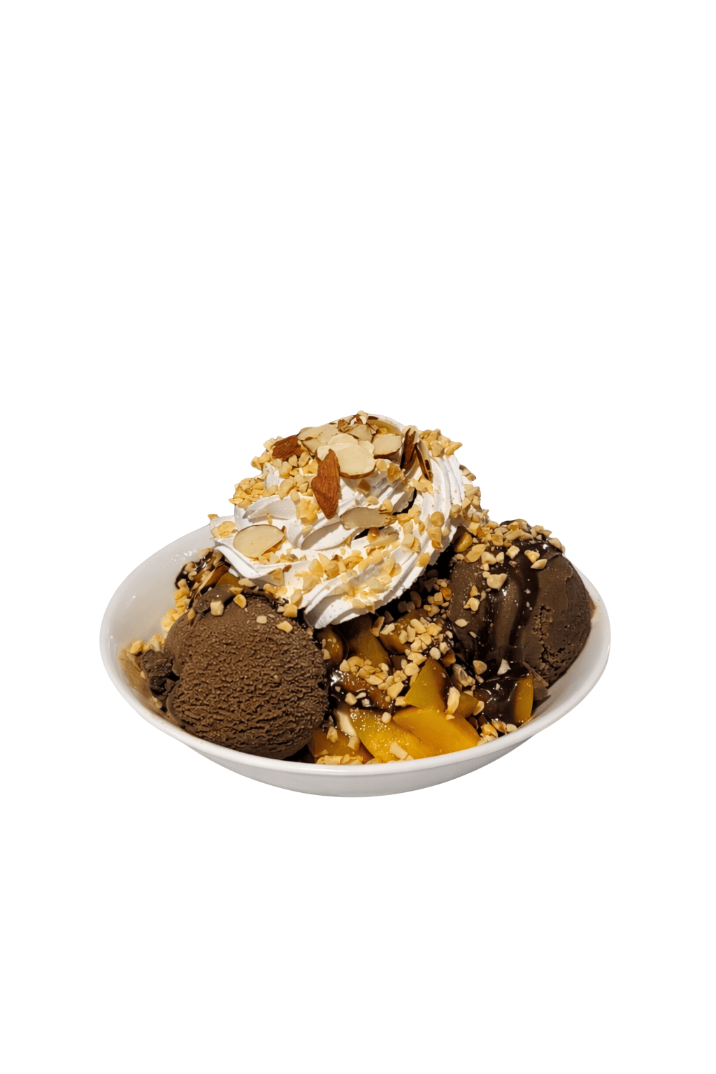 Helado de Vainilla y Chocolate, Topping de Chocolate, Melocoton, Chantilly, Mani y Almendras