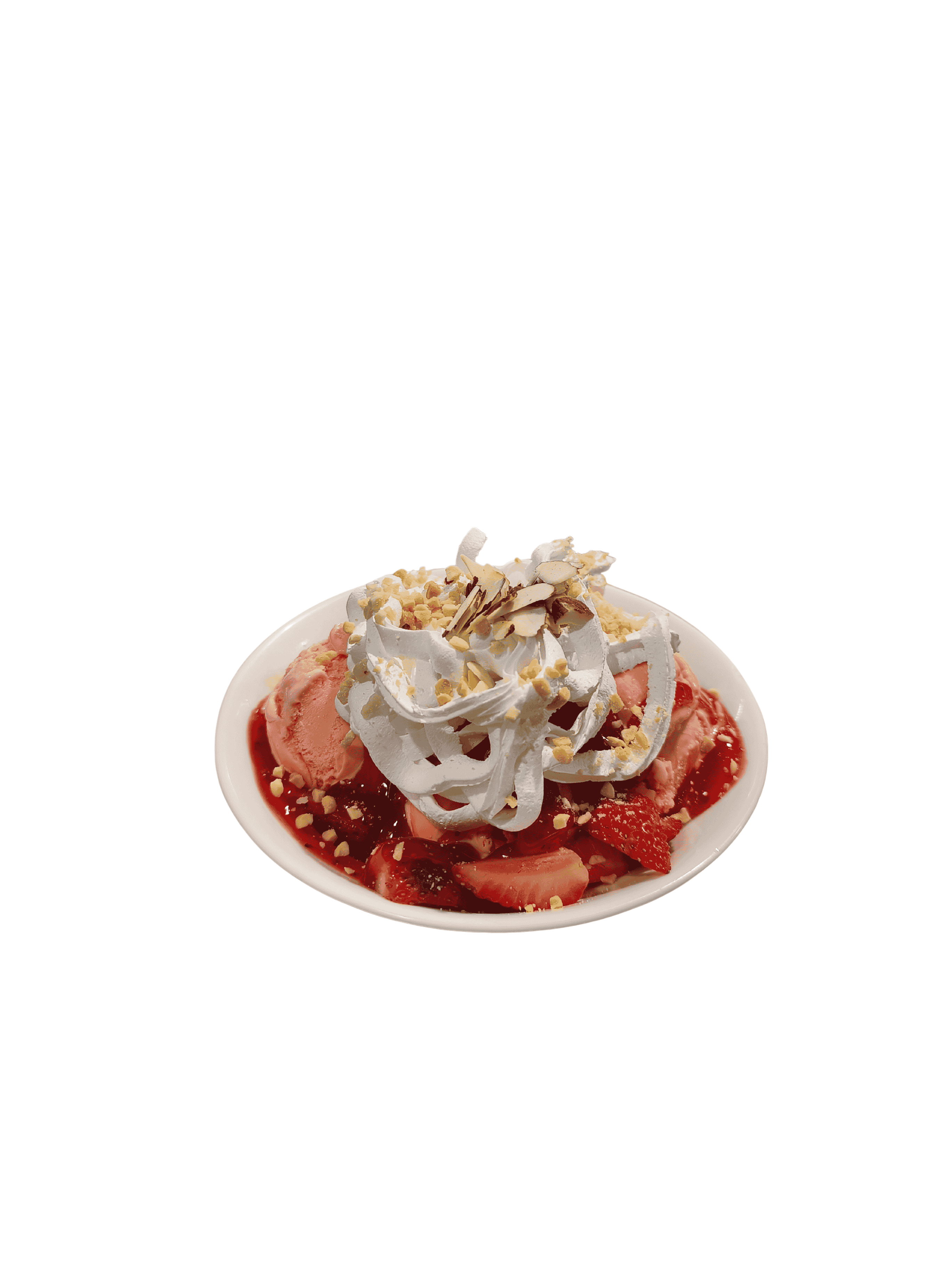 Helado de Vainilla y Fresa, Topping de Fresa, Fresas, Chantilly, Mani y Almendras