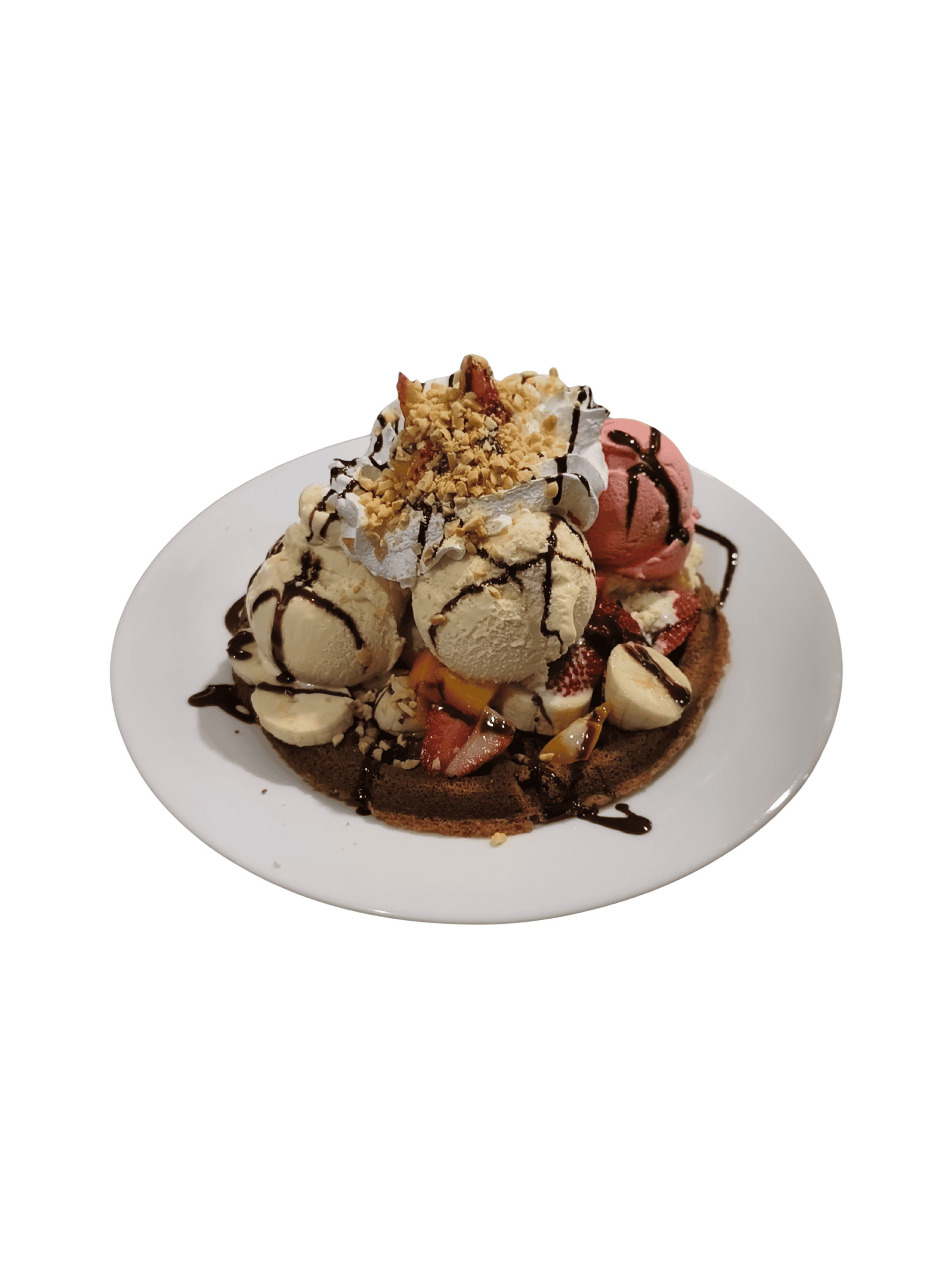 Waffle, Banano, Melocotones, Helados de vainilla y Fresa, Topping de Chocolate, Topping de Limon, Mani Y Miel de Maple